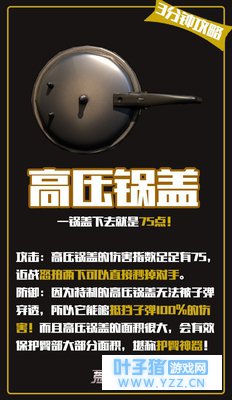 国产冷兵器还有一个是小编的最爱 ——高压锅盖,攻能给敌人造成近身75点的伤害,守可以100%挡子弹,是不是性价比超高,这是小编最喜欢的装备之一啦。