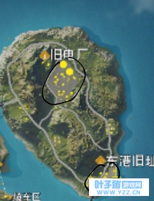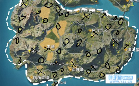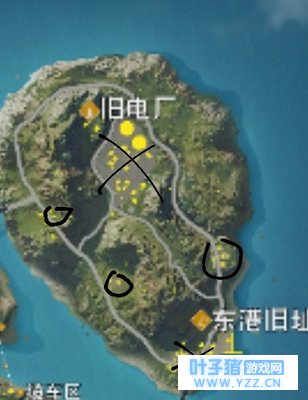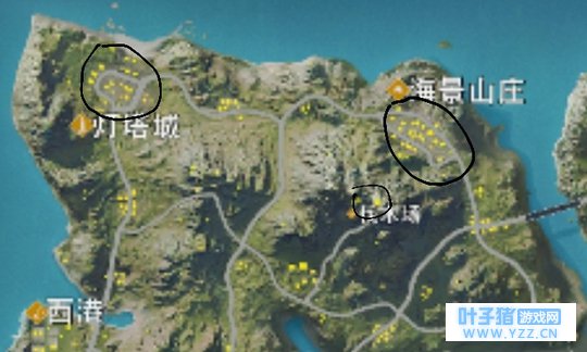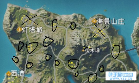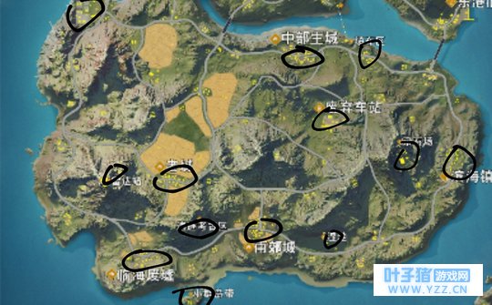用黑笔圈出的是有官方已标的(物资多且地大的)。 像我刚开始玩都会去那些地方,就是认为物资多。后来玩久了,加上在b站看了一些大佬的视频才发现其实不一定要去那些地方,因为有许多人嘛(但那些厉害的可以去拼,我也有时会去,其实这个看技术)~=皿=
