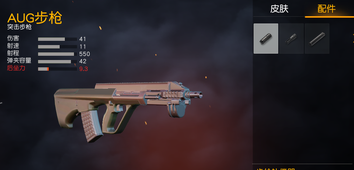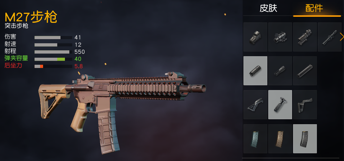 我们先来看看两把步枪的满配面板数据: M27步枪,伤害41,射速12,射程550,弹夹40,后坐力5.3(装备了枪托后的数据) AUG步枪,伤害41,射速11,射程550,弹夹42,后坐力9.3 通过满配状态下的面板数据我们可以看到,作为空投武器的AUG在可装备的配件方面明显少于M27步枪,AUG仅仅只可以装配一个枪头配件,而M27步枪则可以装备包括枪托在内的整整五个配件。而且在满配状态下,M27步枪的后坐力属性明显低于AUG步枪的后坐力属性,这看上去玩家使用满配M27的时候后坐力仅仅会是AUG的一半啊。 接下来我们再来看看实际使用情况的对比情况。