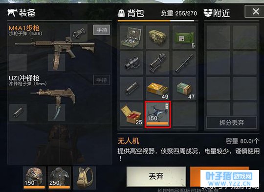所以无人机比MK60、AUG、AWM这些空投枪械都要罕见,相信很多玩家都没有体会过吧。 无人机的定位是侦察道具,可以为使用者提供高空视野,观察周围是否存在着危险,对于整个团队有着非常强的战略意义。 接下来看看无人机各项属性:耐久150,M4A1的伤害为41,所以至少要4枪才能将它击落;电量100,电量耗尽后无人机会直接摧毁,但是期间可以通过“回收”按钮回收,操作时间3秒;容量80,相当大的背包容量,所以如果想带上它一定要留好一定的空间;最远飞行距离大概是100m左右(目前还无准确数据),超过这个距离就无法继续前进,所以各位一定要掌握好距离噢~
