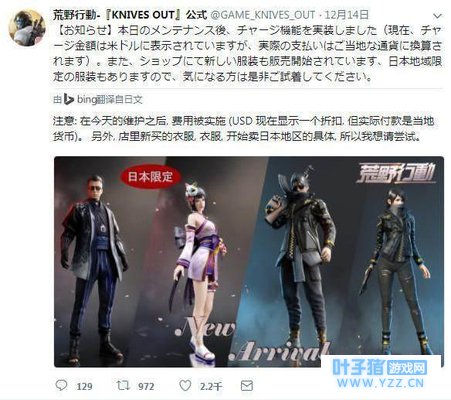 昨天荒野行动在Twitter上公布了更新消息,并点出可以付费获得外观套装,引起了日本玩家的关注。此条Twitter共有129条评论,1000次转发以及2200个点赞,从数据上看荒野行动在日本还是比较受欢迎的。在荒野行动里还出现了大量的日本妹子,让这游戏嗨皮的不行,如果你们遇到一定要好好珍惜啊 |