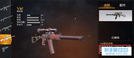 而小游君在寻找88式的时候无意间发现了另外一把狙击枪,那就是Val。同样是自带四倍镜,Val的手感比88式要好太多了,虽然威力稍微小一些,但是Val最大的特点在于自带消音器,这对于小游君这样的LYB来说才是神器。