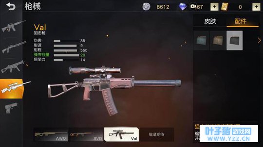 第二把枪则是悄无声息Val,这把枪威力略低与其他狙击步枪且后座力偏大。但是对于配件的要求确实极少的,只用拿一个弹夹。对于不喜欢收集配件,想拿到一把枪就可以大展风采的玩家,这无疑是一个极好的选择,它自带的消音器和四倍镜,完美的诠释中距离默默狙击,防不胜防的风采!