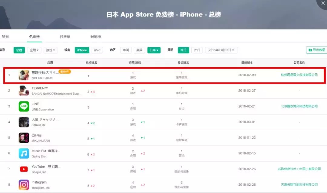 从2017年年末至今,吃鸡游戏的热度节节攀升。不仅在国内市场成绩斐然,在国际市场上也大放异彩。在公认的游戏大国日本,《荒野行动》就连续多日霸榜,被网友戏称为“中日友好交流”的典范。