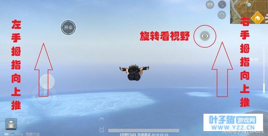 上图就是某次飞行时的截图,如果要飞得远一点,首先就要在跳伞之前判断好调整方向,比如这次航线是西南—东北,所以选择跳伞后右边的视角就要立刻往左调,反之亦然。 然后再将左边的移动按钮往上推,这是控制飞行方向;右边的视角往上提,这是调整飞行角度,双手保持这个姿势,可以到达最远点。在《荒野行动》中,一般最远可以飞行地图上一个半格子的距离。同时可以通过旋转右边的小眼睛来看附近有没有其他人。