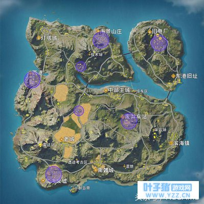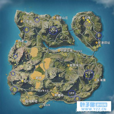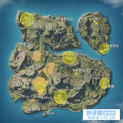 《荒野行动》中的高级物资主要有 三级装备(三级包、三级甲、三级头)、高倍镜、消声配件、高级枪械(AWM、MK60等)、吉利服 等。除了吉利服和部分高级枪械只有在空投获得,其余的玩家都有机会在房屋内收集到。上图中黄圈的部分就是高级物资生成概率极高的资源点,有中部主城、老城、东港旧址、滨海镇、南郊城、灯塔城等等。 一般主城、老城资源密集度比较高,竞争的人也多,是高风险高收益的选择。这两个地点枪战激烈,且不说可能出现落地成盒的情况,很多时候辛辛苦苦搜集到的三级装备也会受到损伤,可能还不如二级装备,不建议新手把这两城作为落地目标点。 所以新手如果既想找到高级装备又不想落地砰砰砰,东港、滨海、南郊和灯塔这几个地方是不错的选择。其一,这些地方房屋不太密集,掩体也较多,玩家容易隐蔽;其二,这些地方位于地图的边缘,可能需要提前准备进入安全区,大部分的玩家都喜欢提前进圈,因此这对新手的压力也小一点。 中级物资生成地点