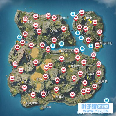 《荒野行动》中的载具主要有 吉普车、面包车、(带枪/不带枪)卡丁、(三轮/两轮)摩托车、大巴车、船只 等等。其中吉普车稳定性好,不易翻车,越野能力强,是乘坐载具的首选。而面包车带有独特的“补漏”标语,而且可以坐十几个人,趣味性强,深受广大玩家喜爱。卡丁也就是蹦蹦车,越野能力强,速度快,但是只能做两个人。摩托车和大巴车也是最近一段时间出来的,但很多人觉得三轮摩托不太好开、容易翻车,而两轮摩托倒是又快有稳,老玩家可以拿摩托来玩玩飙车。 上图中红色车表示陆上载具的生成地方,陆上载具生成是随机的。蓝色船表示生成船只的地方。熟悉载具的位置非常重要,如果航线离理想的落地点较远,新手想要到人少的地方搜一波,那就可以先选择落到载具身边,然后再开车去目标点,这可是低风险高收益的选择。 新手落地目标点选择推荐