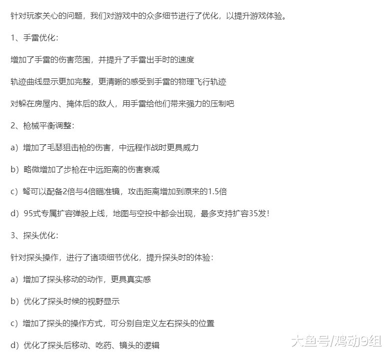 除了上面说的几个重要的更新外,这次得更新对之前的游戏内容也进行了大量的优化,其中有几条优化内容可以算得上是很重要的了。 首先就是手雷的优化了,这次更新后手雷的伤害范围再次被加大了,同时手雷的出手速度也加快了。 可以说以后手雷的作用会变得更大了,各位小伙伴在躲避手雷的时候按照以往的经验也不行了,以前你需要跑出10步远,那么从今以后你就需要跑出15步远了。 除了手雷之外,毛瑟狙击步枪的伤害也增加了,中远距离的作战伤害会更高,同时十字弩现在可以装备二倍镜与四倍镜了,同时射击距离也增加了1.5倍。作为阴人神器的十字弩现在的威力可以说是更加凶残了。