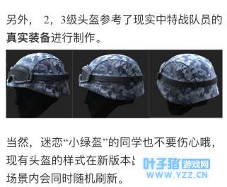 与此同时二级头盔,三级头盔也同时做出了改进,为了尽量提升真实性,设计师直接参考了现实中的特战队员的真实装备进行设计,在吃鸡的战场上佩戴了这种头盔,相信也会特种兵附体吧!战力值瞬间爆表,精妙绝伦的操作,快如闪电的反应,相信一应俱全了吧!喜爱小绿盔的玩家们也不要伤心,在更新后的游戏中依然保留了最原本的设计,满足了老玩家们的要求。
