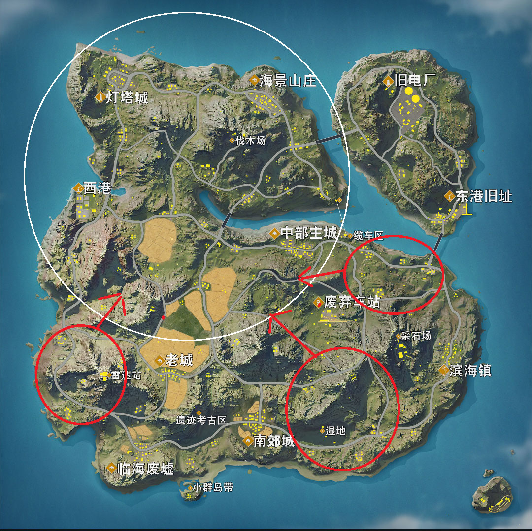 如果以A点为着陆点,我们可以选择运输机在B点附近的位置点击离开,向A点方向冲刺,b直接飞a是最短的距离,可以先着陆,意味着更多的发育时间。切忌当运输机没达到或远离B点后再飞A点位置,这种做法绝大多数时候会被别人追着打。 而大部分玩家的落地位置均处于两条黑线内,亦会有少数玩家落地找车,疾驰向航线以外的物资集中区。对于打野玩家而言,如果你不想落地成盒,游戏初期一定要暂避锋芒,主动避开老城、中部主城等以及飞机航线必经的物资集中区。 落地位置的选择如图所示,红圈的位置是比较适合新手落地打野的位置,落地位置的选择要尽量靠近地图边缘,这样可以保证临海方向无玩家落地,没有威胁。蓝圈的物资区则被其他物资区所包围,容易受到来自四面八方的照顾。黑圈是地图中心位置,四面平原,刚枪玩家首选之地,打野玩家的禁忌之区。黄色五星区域为人流量较大的区域,通常根据信号区的缩小,经常会有蹲守的玩家在此狙击,接近这些区域时需仔细观察。