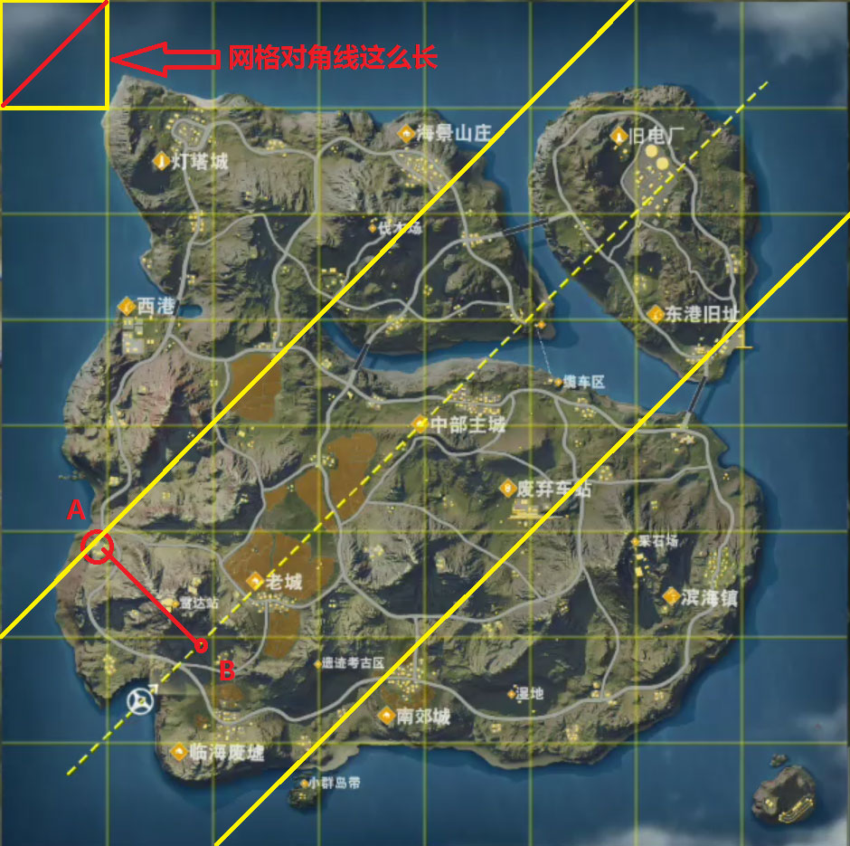 要想在《荒野行动》中夺取全场桂冠,操作、意识和运气缺一不可。这一节介绍的是适合新手的战术——打野。作为一名萌新,这些打野基础知识你一定要懂! 开局地图信息的收集首先我们必须了解的是,跳伞的最长距离是多少? 如下图所示,红线长度为从跳伞到落地的最远距离,不论是什么角度,跳伞也只能在地图上跳那么长的距离,所以请务必牢记这个极限距离!相当于地图网格一个大格子的对角线那么长。