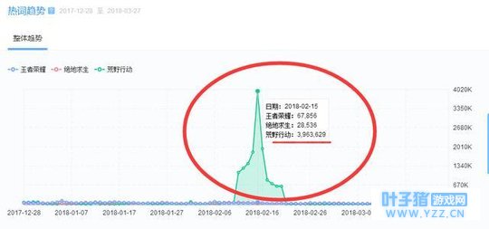 我们看早期一些的,荒野行动的微博热词搜索量在过年那几天居然异常的高,特别是除夕那天接近快400万的搜索量,不过随后断崖式下跌,估计那天是有什么活动所以导致搜索量这么高。