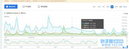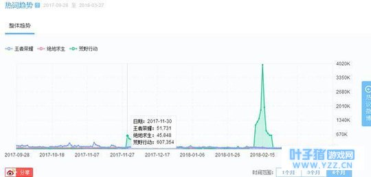 同样是除夕那一天,百度指数这边的搜索量还是比较靠谱的,王者荣耀搜索量30多万,绝地求生和荒野行动都在10几万。