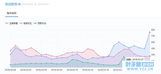 首先我们以王者荣耀,绝地求生和荒野行动3个热词在百度指数作对比,在3.27的搜索热度中王者荣耀表现依然抢眼有13万之多,绝地求生也有11万之多,而荒野行动也就只有近4w的搜索热度,可见最近荒野行动的表现确实很不理想。