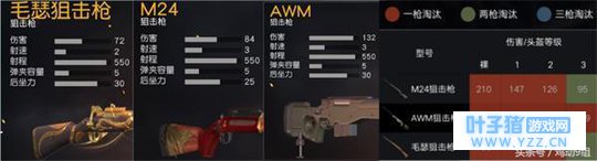 俗话说工欲善其事必先利其器,想要能够熟练的掌握狙击步枪的使用技巧,那么第一步要做的就是要对于各种狙击步枪拥有一个清楚的了解。今天小编我就着重的说一下游戏中的三把能够做到一枪爆头的单发狙击步枪,也就是毛瑟狙击步枪,M24与AWM。 通过对比图可以清楚的看到,伤害方面没有什么好质疑的:AWM>M24>毛瑟。 对于三把狙击步枪来说,一级与二级头并没有任何区别,三把狙击步枪都可以做到一枪毙命,不过对于三级头,只有AWM可以做到一枪毙命,不过也不需要过于担心,M24与毛瑟就算不能一枪毙命,对方也只剩下了一丝血皮,只需要迅速的切换到步枪随意的点射几枪就可以带走对方。