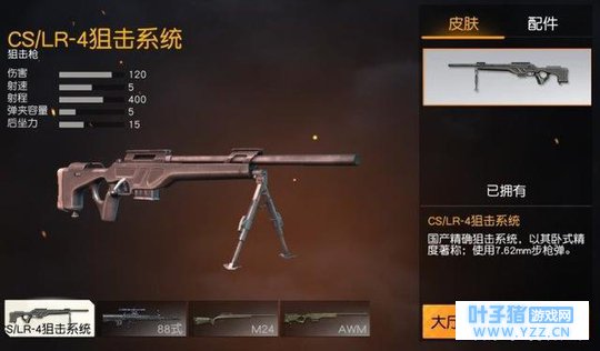 这把国产的狙击枪,在游戏中的伤害为120,射程为400米,后座力为15,最高可以容量5发子弹。这把强和88式狙击步枪一样带有支架。 在伤害方面比88式高,但还是仅次于AWM的132的伤害。