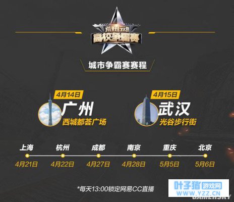 目前,广州和武汉的比赛流程已经公布。广州站将于4月14日西城都荟广场打响,武汉站将于4月15日在光谷步行街进行,更多比赛场地即将公布,敬请留意高校争霸赛专题网站。届时,欢迎广大《荒野行动》爱好者前往比赛场地观赛,每个比赛日中午13:00进行直播。若比赛进行期间有选手放弃比赛,主办方也会从比赛现场招募观众参赛。如果你无法前往赛事现场为选手加油助威,网易CC直播也将对城市争霸赛的赛事进行全程直播,线上围观比赛更有10万好礼相送。 当城市争霸赛完成了全部八个城市的比赛后,25支晋级队伍(24支由城市赛晋级而来,1支为人气战队)将进入全国总决赛,角逐首届《荒野行动》高校争霸赛总冠军头衔。更多全国总决赛的赛事信息我们将在后续公布。