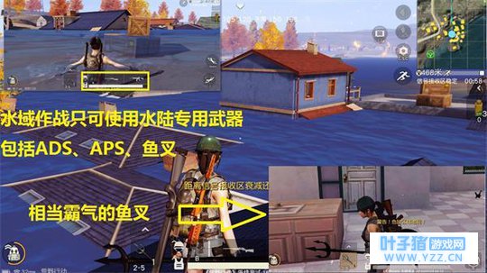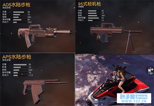 新增枪械载具新增枪械:95式轻机枪、APS水陆步枪、ADS水陆步枪、鱼叉;新增载具:雪地摩托和水上摩托。95式轻机枪隶属冲锋枪,各方面数据仅次于空投物资MK60,属于普通冲锋系列中的佼佼者;APS水陆步枪,步枪最高高伤害、低弹夹容量、短射程;ADS水陆步枪,较高伤害(48点同AK-47),短射程;鱼叉,唯一一把水陆两用冷兵器;雪地摩托,这个当然是雪地专用,体验滑雪的感觉;水上摩托,第二个水上载具,体积小,速度快。
