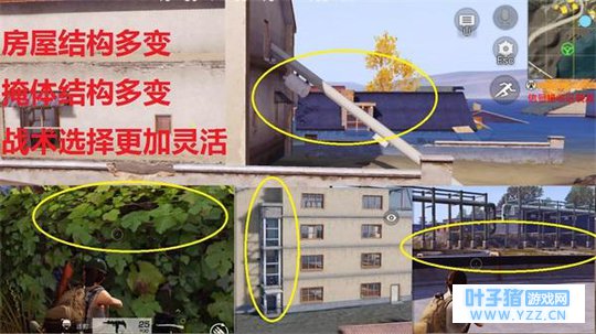 全新大地图此次新地图“飓风半岛”更加具有特色、具有现实感,地形地貌更加丰富,场景更加立体、多元化,作战选择多样。从神秘的雪山古堡,到环形山盆地;从延绵起伏的平原丘陵,到热带风情的海滨小镇;从温馨浪漫的薰衣草田,到宏伟壮阔火箭发射基地。在开始匹配前,玩家可以勾选进入新地图或者老地图,也可随机进行匹配。相对于经典老地图“激战原野”,新地图整体物资分布更加密集,避免了落地无处可去的尴尬;新地图新增了大量建筑及障碍掩体,地形地貌的复杂化增加了游戏战术路线选择,不熟悉新地图的小伙伴记得要提前开车跑咯。