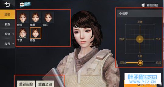 脸部设置 目前体验服中,脸部总共有颏颔 面靥 天庭 下颌 四白 五个可选项目供玩家进行调整,分别可以进行总共六种属性的设置,可以说非常的完善了。