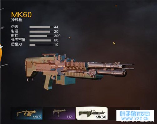 可以看出虽然两者同为95式系类,但是由于属于不同枪械种类,产生差别大。 95式轻机枪定位冲锋枪,射速快,不吃配件,上手既可以战斗,在前期装备匮乏时候,95式轻机枪明显比95步枪占有优势。 在中后期,装备起来,95式步枪反而占有优势,射程远、稳定性好、伤害高,最大弹夹容量达到65发,特别是后坐力和伤害在后期尤为重要,所以大部分玩家会选择95式突击步枪,属于《荒野行动》最具代表性的国产利器。 如果95式轻机枪与MK60比较谁更占优势呢? MK60: 伤害:44 射速:20 射程:300 弹夹容量:60 后坐力:10