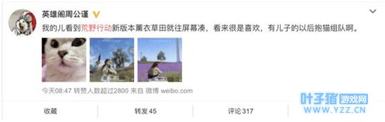玩家当然是好评如潮,很多知名主播更是第一时间试玩打call,四盒院最强男人周公谨不光自己玩的嗨,把自己“儿子”也成功安利成为荒野迷妹/弟,话说猫儿子,你是不是看中了薰衣草田可以偶遇漂亮妹纸啊