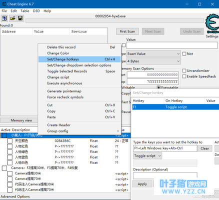 ”物品红色gamma值地址:[[["hyxd.exe"+1B9A678]+AC]+E0]+E0,float类型,直接把该数值改成1000会导致账号被封,具体原因暂时不清楚。“