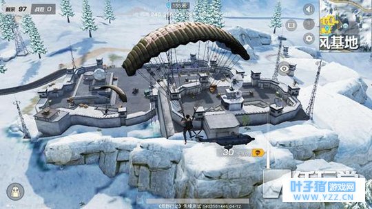 飓风基地,同样位于冰川地带,也在新地图上最西南的角落位置。它拥有不亚于古堡的庞大外围防御墙,内部空间宽敞,建筑分为多层排布,唯一的入口是大方敞开的正门。如果有人在内部架枪,即使用烟雾弹强攻进去也很难突破其防线,是个得天独厚的防守圣地。值得注意的是基地后方虽然摆了台霸气的直升机,但可惜那只是个摆设,并不能开。