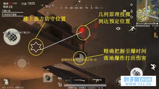 3、几何雷:以上两种使用雷的使用方法需要把握的是引爆时机,而几何雷则是一种操作的技巧,就是利用几何原理,提前预算一波手雷撞击建筑物的反弹曲线,达到改变落点的效果,通常用于处理卡位刁钻的敌人。 不过小杨要提醒大家,游戏中给出的弹道曲线并不考虑投掷物的弹射效果,所以几何操作需要自身来判断,配合瞬爆雷操作,会对敌方造成致命伤害。 即使操作不成功,也不要弹到自身或队友脚下,否则这个锅,就是你的啦!