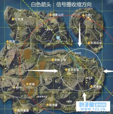 信号圈刷新时间游戏开始,当地图上刷出一块安全区域后,天命妹便开启了暴走模式。到了第五次信号收缩时,决赛圈基本上只收缩在一小块区域,如下图所示: