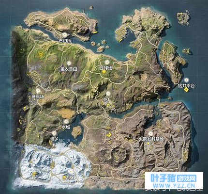 飓风半岛地形丰富,上半部分以平原为主,下半部分以悬崖、瀑布、冰川等复杂地形为主,丰富多变的地形,同时也造就了许多景观场景,火箭发射基地、足球场、古堡等等新场景,已经成为玩家首跳必争之地。