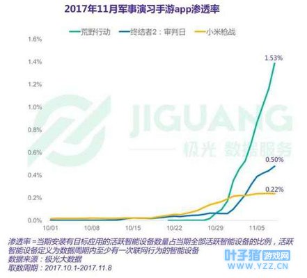 中国各大游戏厂商似乎看到了商机,在手机端另辟蹊径,研发出了各式各样的吃鸡类游戏,如《荒野求生》、《终结者2》、《小米枪战》等等,遍地花开,一时令玩家眼花缭乱,难以抉择。 但是在10月到11月事情发生了微妙的变化,《荒野求生》在这群同类型游戏中脱颖而出,甚至超越《王者荣耀》登顶APP商店榜首。我们来看看十一月份吃鸡类游戏的APP渗透率,在起初《小米枪战》略占优势,但是在十月底十一月初,三方逐渐拉大了差距,《荒野求生》异军突起,强势登榜。