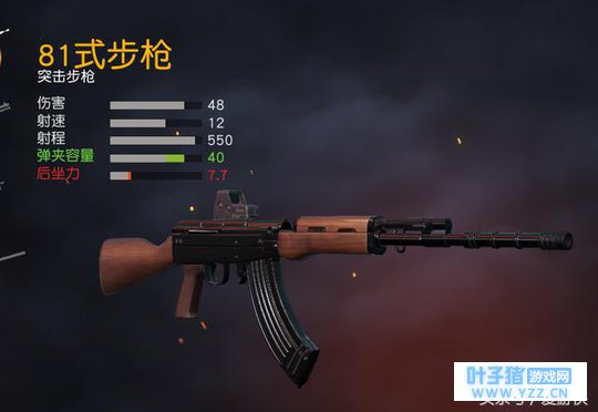 81式步枪: 伤害:48 射速:12 射程:550 最大弹夹容量:40 最小后坐力:7.7