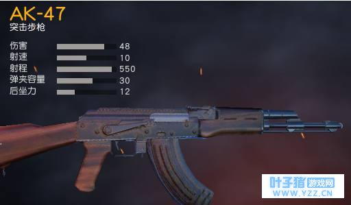 MK60作为一把冲锋枪竟也上了榜?没错!这把冲锋枪不仅有着超强的伤害,并且射速仅次于冲锋枪里射速最高的UZI,射程也是中距离里比较好的!不过它只会出现在空投中呦~ 第三名:AK-47步枪