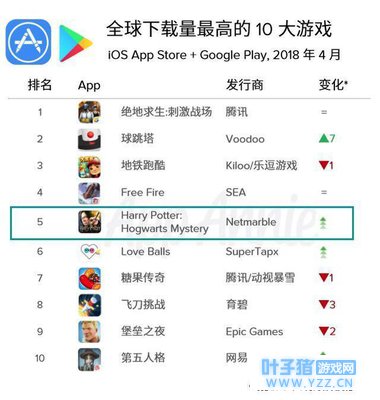 《第五人格》的成功,除了游戏本身的优秀品质之外,“杀鸡”品类的市场空白也是一个重要原因。从一贯的5V5到1V4,非对称性玩法的出现对于大众用户而言是非常新鲜的,《第五人格》的热度也证明了“杀鸡”这种与“吃鸡”具备同样潜力的玩法题材有相当大的市场空间。在接下来的游戏市场,非对称竞技或许会成为竞技手游的突破口。 二、《哈利波特:霍格沃茨之谜》空降4月全球下载榜TOP5,超级IP吸量能力惊人 在4月份的手游榜单上,除了“吃鸡”和“杀鸡”,还有一款IP改编手游表现十分突出。由Jam City携手华纳兄弟制作的手游《Harry Potter: Hogwarts Mystery》(哈利波特:霍格沃茨之谜),空降全球iOS & Google Play下载榜TOP5,同时还登上了4月美国iOS & Google Play下载榜TOP5,日本iOS & Google Play下载榜第7位。