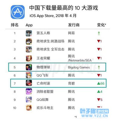 iOS中国 三、凭借短视频平台带动,《物理弹球》、《亡命时速》进入下载榜TOP10 4月份的中国iOS下载榜TOP10中,《物理弹球》和《亡命时速》这两款轻游戏分别登上了第5位和第7位,在腾讯网易的夹攻之下成功突围。