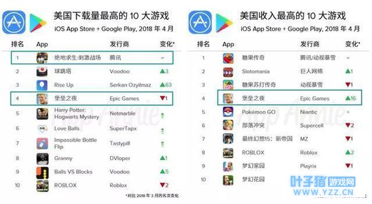 而手游那点事发现,在月度收入TOP10的排名中,上个月腾讯网易首次完全垄断了这十个位置,而这个月继续保持这一趋势,丝毫没有要让位的意思。尽管知道这两家游戏巨头的强势,但以往多少会看到有一两款挤进前十,如偶尔蹿升的《FGO》、2月份正当红的《恋与制作人》、过年前突围的《大天使之剑H5》、甚至是2017年Q4多家厂商发力的部分拳头产品等,都曾进入过收入榜单前十,打破这种僵局。 但从这两个月的局势来看,这两家大厂将营收水平和门槛提升了不少,加之两家今年的游戏新品大作逐渐发力,TOP10的入场券对其他游戏厂商来说,已经越来越遥远了。 五、美国榜:《刺激战场》用户量力压《堡垒之夜》,但营收不敌 美国iOS & Google Play游戏下载和收入榜单上最受国内从业者和玩家关注的无疑是《绝地求生:刺激战场》和《堡垒之夜》两款吃鸡大作之间的比拼。而从整个四月份的成绩来看,《刺激战场》(海外版本叫《PUBG Mobile》)的下载量稳占第一,《堡垒之夜》则排于第四;但收入方面,《堡垒之夜》上升了16名排于第四,而《刺激战场》则因开付费时间较晚等原因,没有挤进TOP10。由此可见,这两款游戏距离一决高下还有挺长的路要走。