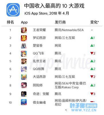 QuestMobile发布的2018年春季大报告数据显示,2018年Q1短视频行业MAU已达到4亿以上,3月份的渗透率高达42.1%。随着抖音快手等短视频平台在短时间内的快速崛起,越来越多的游戏也因此走红,屡屡冲上App Store游戏畅销榜TOP10。作为一个新兴渠道,短视频平台的庞大流量足以让游戏厂商心动。不过目前为止,短视频平台的游戏推广方式仍然处于摸索状态,再加上平台买量成本的上涨,厂商入局还需谨慎。 四、垄断加剧:国内iOS收入TOP10已经是腾讯网易的天下了 4月份的国内iOS收入榜可以说是近一年来榜单变化最不明显的一个月了。前十名全都是老面孔,MMO类的《梦幻西游》手游、《楚留香》、《大话西游》手游、《倩女幽魂》手游,MOBA类的《王者荣耀》,竞速的《QQ飞车》、SLG类的《乱世王者》等等,霸占榜单前列早已不是什么新鲜事。