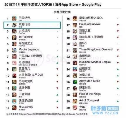 诚然,与端游《绝地求生》相近的画风、玩法、操作使得《PUBG Mobile》受到大量玩家的喜爱,在欧美地区同样吃香。根据SensorTower此前的报告显示,在《PUBG Mobile》开放内购功能前,这款游戏在iOS平台已经吸引了约2200万玩家下载,这项数据相当于《堡垒之夜》手游iOS版本首周下载量(370万)的6倍。 但从首周收入来看,《PUBG Mobile》在苹果App Store首周收入大约为70万美元,而《堡垒之夜》手游首周收入则达到了370万美元,是前者的5倍。 两款游戏在内购上稍有不同,《堡垒之夜》手游更倾向于向玩家出售限时道具和日常道具,另外玩家还可以花10美元的月费购买“战场通行证”。而《PUBG Mobile》则是向玩家出售随机的战利品宝箱。 六、日本榜:《荒野行动》稳占第一,将和《PUBG Mobile》一决高下 在4月日本iOS & Google Play游戏榜中,《荒野行动》仍然稳居下载量第一的位置,同时收入也有所上升,排在收入榜第6位。 日本市场可以说是《荒野行动》出海最成功的一个市场,收入占海外总收入比例超过95%。在SensorTower发布的4月中国手游海外收入TOP30中,《荒野行动》吸金量仅次《王国纪元》。