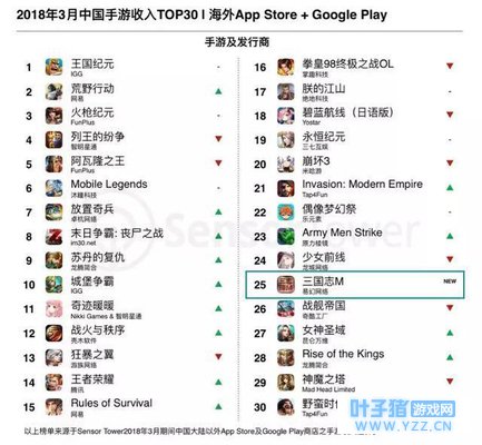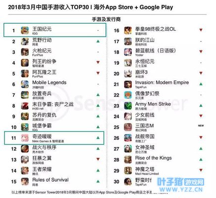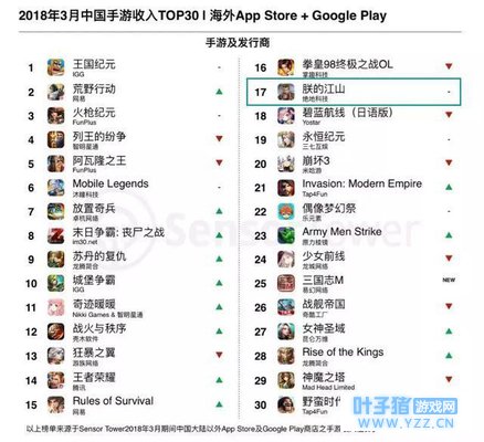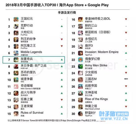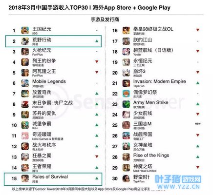 “出海”一直牵动着众多发行商的心,特别是进入2018年之后。 “吃鸡”手游《PUBG Mobile》在海外市场的火爆,可以说是近期中国手游出海的最大热点了。然而除此之外,在3月份,国内手游出海交出了不少亮眼的成绩单,《荒野行动》在收入上增长迅猛,排名第二;《放置奇兵》通吃海内外,成近期黑马;Efun新作《三国志M》横扫韩国市场;《朕的江山》引领SLG在日韩突围。3月份中国手游出海的具体成绩到底如何?今天(4月13日),数据分析公司SensorTower发布了2018年3月中国游戏出海报告,报告揭示了2018年3月中国手游在海外的收入TOP30和下载量TOP30。 以下是手游那点事带来的相关解读: 一、《荒野行动》海外收入第二,日本占比95%以上 在出海收入榜上,前五的位置一向都被SLG所垄断,欧美地区对这类型游戏的青睐程度远超想象。因此包括《王国纪元》、《列王的纷争》、《阿瓦隆之王》等游戏成为了榜单前列的常客。 然而在今年2月及3月,《荒野行动》的海外版《Knives Out》却出乎意料地打破了这一规律。1月份还排在收入榜第24名的《Knives Out》,2月份已经飙升至第5名,而3月份已经挤进TOP3,排名第二,超越《火枪纪元》、《列王的纷争》、《丧尸之战》等出海大鳄。