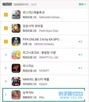 无论是海外还是国内,大方向上游戏市场的发展都朝着强竞技、强社交的产品倾斜,和MOBA、“吃鸡”、MMO等重度游戏相比,放置类游戏的玩法比较轻度,相对来说有着一定的市场空白。 另外,随着市场、用户口味的更迭,放置类游戏在玩法上融入的元素也逐渐增多,“放置+”几乎是后来这一类型游戏的主调。“放置+卡牌”的《放置奇兵》通过加入卡牌游戏的玩法增加了游戏的可玩性,多样化地满足玩家需求从而减少玩家流失。 三、Efun《三国志M》横扫韩国市场,上线不足一个月收入排名TOP25 在3月份的收入榜TOP30中,Efun的《三国志M》是入榜手游中的唯一新作。这款3月10日在韩国市场上线的SLG游戏凭借不到一个月的单国收入,排在了出海收入榜第25位,吸金速度可谓惊人。