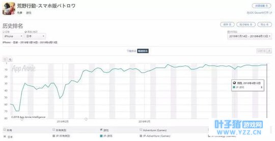 也就是说,自从去年12年开启变现之后,《Knives Out》的吸金量就直线上升。而根据SensorTower的数据显示,《荒野行动》的海外收入来源中,日本玩家的花费最大,且目前还在持续扩大,占比从2月的约92%上升到了3月的95%以上,占绝对优势。其中,约84%来自iOS玩家。 从畅销榜的排名情况也能看出这款游戏的吸金程度,《荒野行动》目前已经在7个国家地区进入了畅销榜TOP5,11个地区进入TOP10。而在最让人眼前一亮的日本市场,从今年2月产品调优达到一个比较好的状态开始,排名就一路走开,目前依然稳在畅销榜TOP3,仅次于《怪物弹珠》和《FGO》。除此之外,《荒野行动》目前稳占日本游戏免费榜第一。看来《荒野行动》确实有两把刷子,毕竟不是谁都能拿下“变态”的日本市场的。
