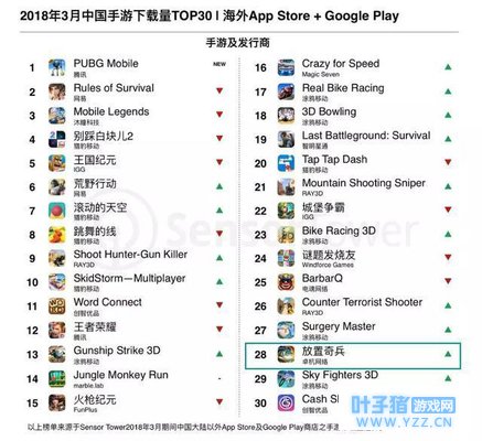 《放置奇兵》在下载量方面的表现也相当不错,进入了3月中国手游海外下载量TOP30,排在第28位。