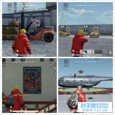 随后我们又参观了雪山区域的飓风基地和古堡,小姐姐兴致勃勃的试了试起重机,话说起重机根本就不能开的吧。而小游界对基地里的打靶场比较感兴趣,还有飓风基地居然有一架直升机!但是没有螺旋桨,不能开。古堡里的壁画画风好独特啊,这算是在游戏里打广告吗?