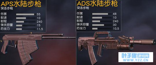两把枪的造型各有特点,APS的弹匣非常有特色,其他的武器是"一个弹匣",APS是"一面弹匣"。ADS的造型则有点像国产的95式突击步枪,不同点在于枪管稍长了点。两把武器主要的不同点在于伤害和弹匣容量,这也是武器的特性决定的。APS只支持单发射击,所以伤害高一点。ADS支持全自动扫射,所以伤害低点,弹匣的容量也是APS的两倍。值得注意的是,两把枪都不支持配件拓展,所以在陆地携带风险较高。