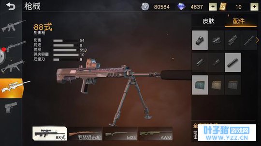 88式狙击步枪 这把也是国产的狙击枪,之所以也把它放到这篇文章中,狗子认为在连狙中88式完全可以说得上是最强。虽然与VAL一样都自带四倍镜,但88式还有两脚架也可以打开,后坐力可以降低到9。搭配超高的射速,远距离的震慑能力相当强。但是因为伤害不高,所以不能像AWM那样一枪一个小朋友。