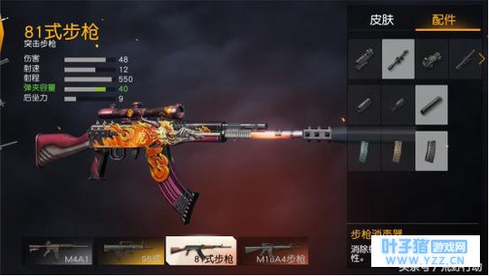 81式突击步枪,结合了56式自动步枪与56式半自动步枪的优秀设计,支持点射与三连射,中远距离步枪;使用7.62毫米子弹。 使用7.62毫米子弹的81式步枪,继承了7.62毫米子弹系枪械的优良血统——超高伤害!48点的伤害,试问有谁能在81式的枪口下逃脱? 再来看看其他基础属性,射速12,射程550,后坐力只有9!毫不逊色于步枪之王M27!看来这次是真遇见对手了! 如果说上面的基础属性,仅仅是让81式步枪与M27处于同一水平,那M27的高成长上限,尚能压制81式一头,毕竟满配后的M27,跟没装配件的M27区别那是一个天一个地!