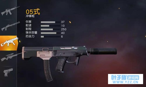 顾名思义,05式的最大特点就是——安静。在游戏中,05式冲锋枪有着自带消音器的特色,在落地钢枪时就不怕暴露自己的位置了。除了声音轻,05式冲锋枪还具有高弹容量以及超低后坐力等特点。在这之前,冲锋枪里弹容量最大的是MP5的30发子弹,但是05式微声冲锋枪有着高达40发子弹的超大弹容量,在钢枪是能大大增加你的容错率。较低的后坐力也能让你在近战时更如鱼得水,在近距离作战大获全胜。