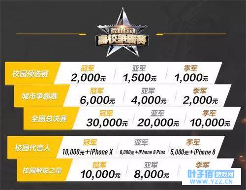高校之星奖励 与此同时,《荒野行动》高校之星活动也将在此舞台进行最终的颁奖环节,其中校园代言人冠军可获得10000元现金奖励外加一台iPhoneX手机;亚军可获得8000元现金奖励外加一台iPhone8 Plus手机;季军可获得5000元现金奖励外加一台iPhone8手机。而校园解说之星的冠亚季军将分别获得10000元、8000元和5000元的现金奖励。 《荒野行动》首届校园争霸赛决赛将于5月27日空降广州,等待着各位的将是一场场精彩绝伦的荒野巅峰之战!想来现场亲身感受着火热的电竞氛围?还是想为自己支持的战队摇旗呐喊?5月27日,线上线下我们不见不散! 本文来源:一点资讯,作者:66173手游交易,转载请注明来源。 |