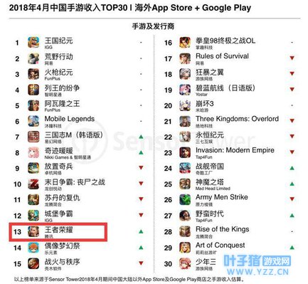 网易能在海外收入这块一直保持稳定增长,主要还是归功于游戏品类的全面覆盖以及多元化的出海策略。《阴阳师》在Sensor Tower公布的2017年度出海收入榜中杀进Top 10,随后在2018年网易又有两款吃鸡手游的成功商业化续航,此外还将《大航海之路》等产品的海外发行交给其它厂商,后续则还有《第五人格》的出海计划。可以说,不管是针对北美、日本、韩国等大市场,还是港澳台及东南亚等地域市场,网易都能拿出符合当地市场的产品和运营。 | 腾讯:《王者荣耀》和《绝地求生》即将步入收割期 App Annie上一份中国出海厂商排名是在2月发布,当时腾讯排名第22,到了4月,腾讯一跃杀入到第10。能有这么大的收入提升,主要还是归功于《Arena of Valor》和《PUBG mobile》两款产品(以下简称为AOV和PUBGM)。